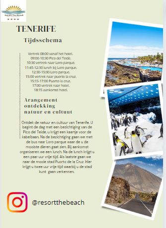 Vertrek 08:00 vanaf het hotel. 09:00-10:30 Pico del Teide. 10:30 vertrek naar Loro parque. 11:45-12:30 lunch bij Loro parque. 12:30-15:00 Loro parque. 15:00 vertrek naar puorto la cruz. 15:15-17:00 Puorto la cruz. 17:00 vertrek naar hotel. 18:15 aankomst hotel.