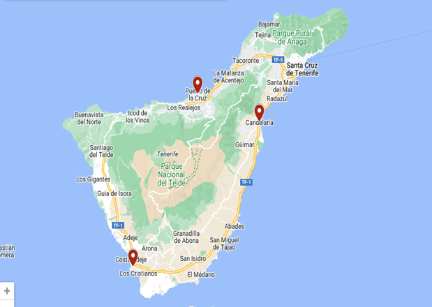 Playa de las Americas: Op deze locatie kan je genieten van zon, zee en strand. Deze badplaats heeft verschillende stranden, uitgaansgelegenheden en nog veel meer. Het weer is bijna altijd goed meestal rond de 25 en 30 graden. Ook zijn er heel veel leuke excursies te doen zoals snorkerkelen met dolfijnen.
